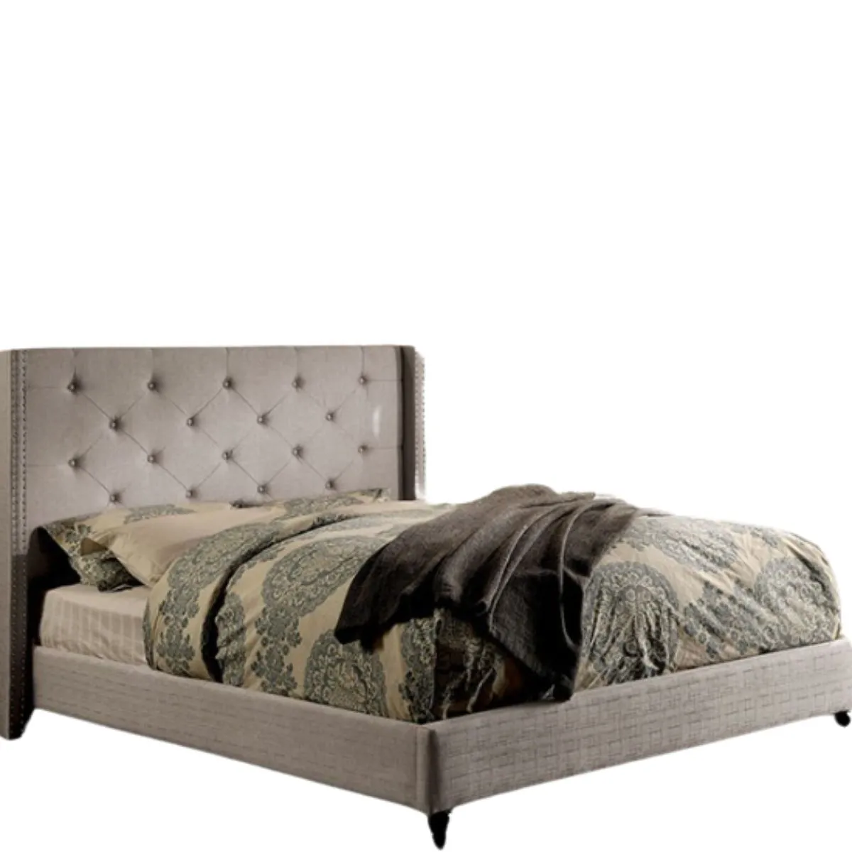 Esta Cama es Una pieza audaz y llamativa que realza el atractivo de cualquier dormitorio esta cama es un éxito seguro para crear un ambiente de descanso contemporáneo. El cabecero extragrande con respaldo de alas presenta un llamativo capitoné con botones y un doble forro con ribete de tachuelas. La tapicería de imitación de lino envuelve firmemente la estructura de la plataforma garantizando una estética limpia y acogedora.
