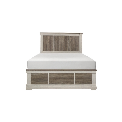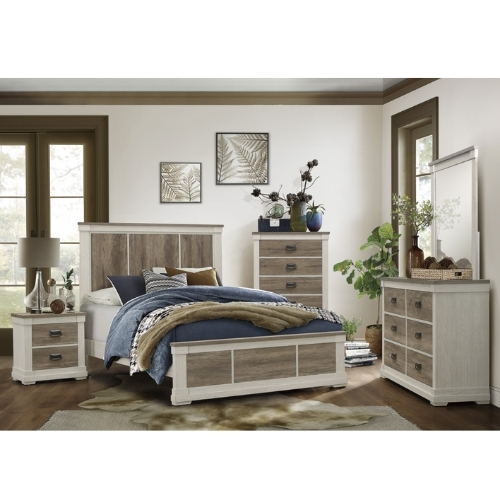Diseñada para tu dormitorio de estilo de transición está la colección Arcadia. El aspecto bitono de la cama completa se logra con un marco blanco y una chapa de imitación de madera estampada en gris abigarrado.