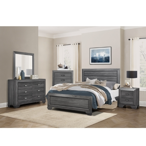 Combinando los elementos del diseño contemporáneo y la estética rústica la colección Beechnut es una adición única a su dormitorio. Los paneles inferiores oscuros sirven para resaltar el acabado gris de la chapa de imitación de madera en relieve de los paneles elevados de la cama Full. También disponible en acabado natural.