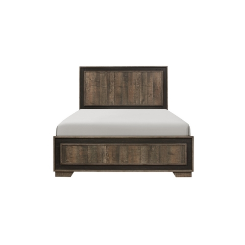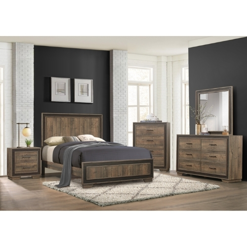 Las líneas modernas y la estética rústica se entrecruzan en el diseño de la Colección Ellendale. La chapa de madera sintética en relieve de la cama de tamaño completo crea la apariencia de tablones de madera con acabado de caoba auténtico enmarcados con chapa de madera sintética en relieve en contraste en un ébano oscuro.