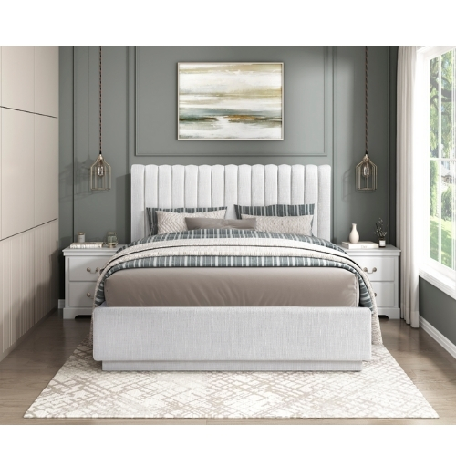 Cree un punto focal lujoso y moderno en su dormitorio con esta cama de plataforma natural de tamaño completo. Con una robusta estructura de madera contrachapada y una tapicería de tela de textura suave con elegantes mechones de canal en la cabecera esta cama ofrece durabilidad y un estilo sofisticado. El juego completo incluye una cabecera un pie de cama listones y rieles con mechones de canal que brindan todo lo que necesita para una experiencia de sueño cómoda y de apoyo. Diseñada para eliminar la necesidad de una base o un somier esta cama de plataforma ofrece un aspecto elegante y de perfil bajo que complementa varios estilos de decoración. Es necesario el montaje.