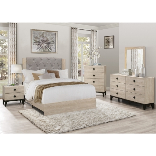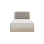 El diseño moderno se acentúa sutilmente y glamuroso en el diseño de la colección Whiting. La construcción de los rieles de la cama permite un empaque conveniente lo que se presta al diseño general del perfil. El perfil ultra bajo y aerodinámico de los rieles y el estribo se traslada al diseño de las piezas de la caja que lo acompañan. El lino gris con mechones adorna la parte delantera de la cabecera lo que contribuye a la presentación dramática coordinando perfectamente con el aspecto de mármol estampado de la cama completa.