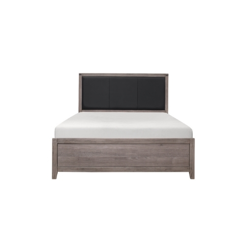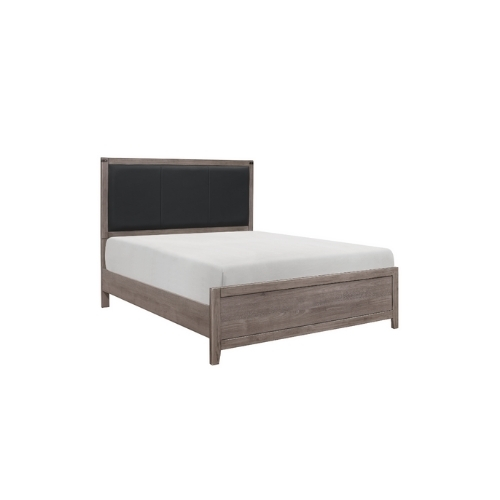 El diseño industrial se utiliza sutilmente para lograr un aspecto fresco para su dormitorio en la colección Woodrow. Las bandas de metal oscuro en las esquinas con detalles de remaches le dan el aspecto informal de la cama completa. El laminado de melamina presenta un aspecto de madera desgastada que realza el diseño previsto. El acento de piel sintética negra de la cabecera proporciona un distintivo contraste complementario con el acabado de la colección.