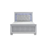 El glamour reina en el diseño de la Colección Allura. El marco de la cama California King es un detalle decorativo de espejo biselado que mejora la iluminación de la retroiluminación LED táctil de la cabecera y el espejo así como la luz inferior de la mesita de noche. El inserto de cabecera de piel sintética plateada con mechones de cristal acentúa audazmente el acabado plateado.