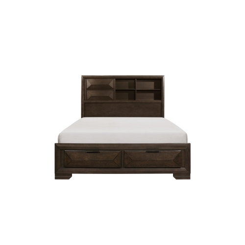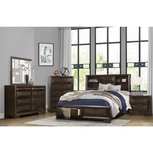 El diseño contemporáneo y la funcionalidad conveniente se cruzan en el diseño de la colección Chesky. La chapa de abedul se termina en un espresso caliente en esta oferta única de cama queen. Los paneles en relieve aportan interés visual a los frentes de los cajones del cabecero y el pie de cama. La cabecera de la estantería proporciona un amplio espacio de almacenamiento y exposición al igual que el pie del cajón de almacenamiento.