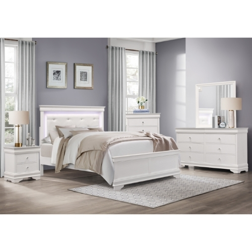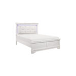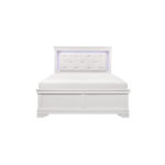La inesperada intersección del diseño tradicional y el estilo glamuroso crea el aspecto dinámico de la colección Lana. Se utiliza un acabado blanco para realzar los frentes en relieve de cocodrilo falso de la cama Queen. La cabecera cuenta con un cabecero de piel sintética con mechones de cristal así como una espectacular retroiluminación LED.