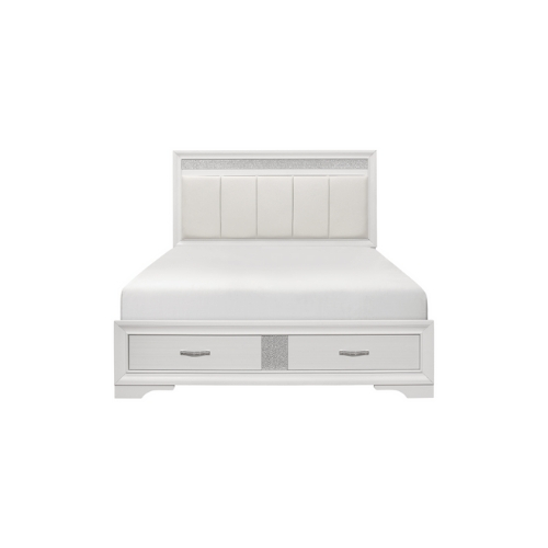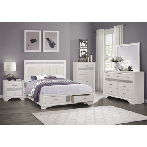 El estilo único de la colección Luster presenta una opción glamurosa para su dormitorio. La chapa de imitación de madera en relieve presenta un acabado blanco que permite que brillen los acentos decorativos de la cama Queen. La cabecera del panel cuenta con bandas decorativas acrílicas de purpurina plateada así como un inserto acolchado de canal de piel sintética plateada.