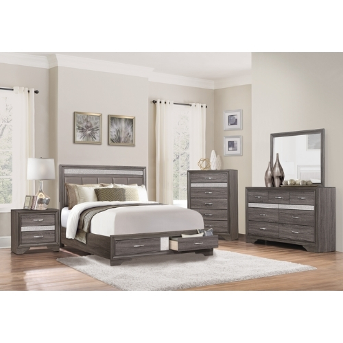 El estilo único de la colección Luster presenta una opción glamurosa para su dormitorio. La chapa de imitación de madera en relieve presenta un acabado gris que permite que brillen los acentos decorativos de la cama Queen. La cabecera del panel cuenta con bandas decorativas acrílicas de purpurina plateada así como un inserto acolchado de canal de piel sintética gris.