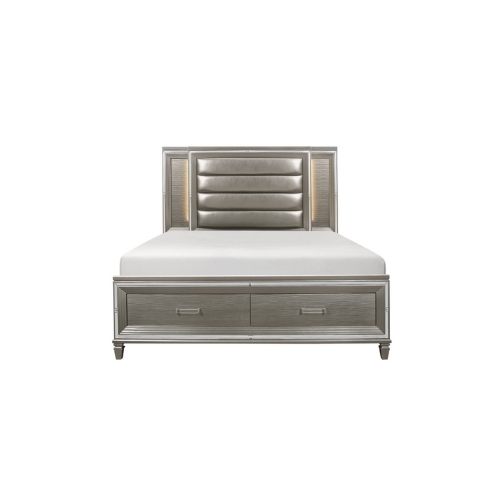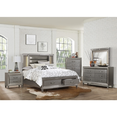 Diseñada para ayudar a que su dormitorio alcance su máximo potencial glamoroso los atributos únicos de la colección Tamsin se combinan para crear una adición elegante y funcional a su estilo de vida. La estructura de espejo proporciona una mejora dramática a la cama queen mientras que la retroiluminación LED de los paneles verticales de la cabecera ilumina y resalta el acabado gris plateado en relieve de la colección. Los herrajes de la barra acrílica proporcionan un toque decorativo discreto a los frentes de los cajones del pie de almacenamiento con el inserto de cabecero acolchado cubierto de piel sintética que contrasta decorativamente con el acabado de la colección.