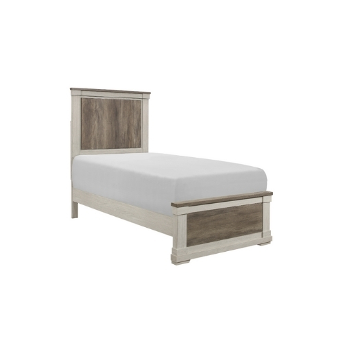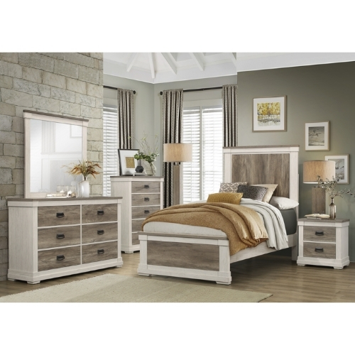 Diseñada para tu dormitorio de estilo de transición está la colección Arcadia. El aspecto bitono de la cama doble se logra con un marco blanco y una chapa de imitación de madera estampada en gris abigarrado.