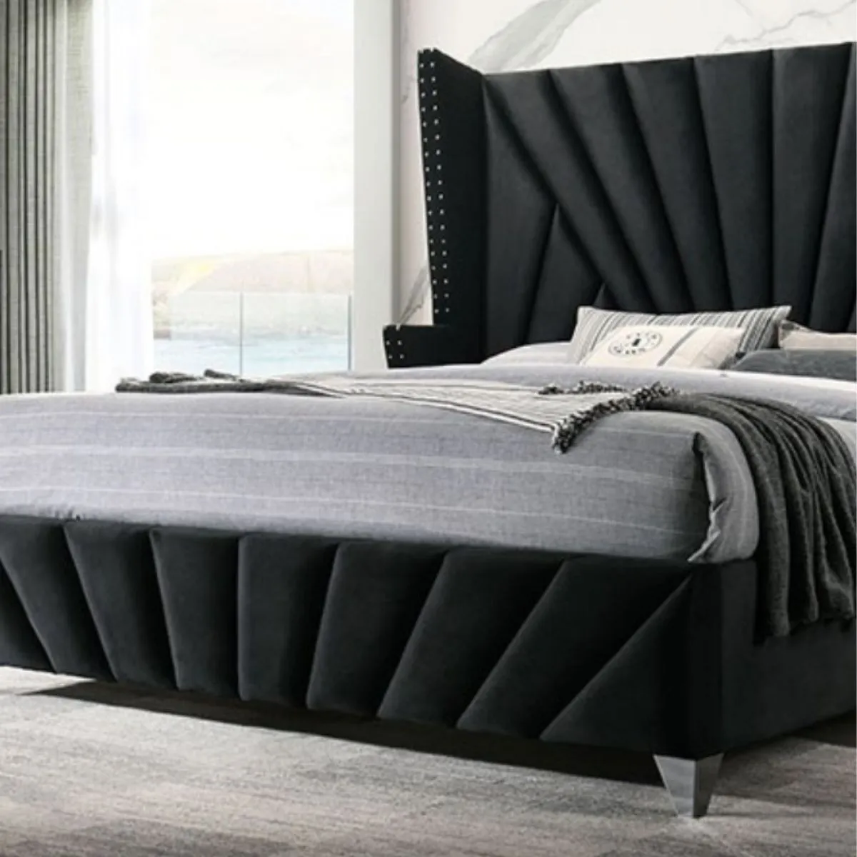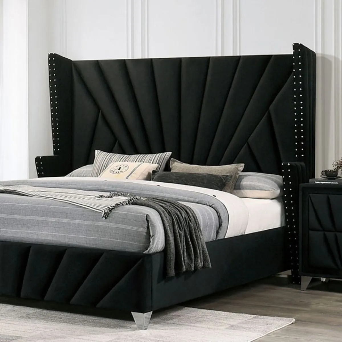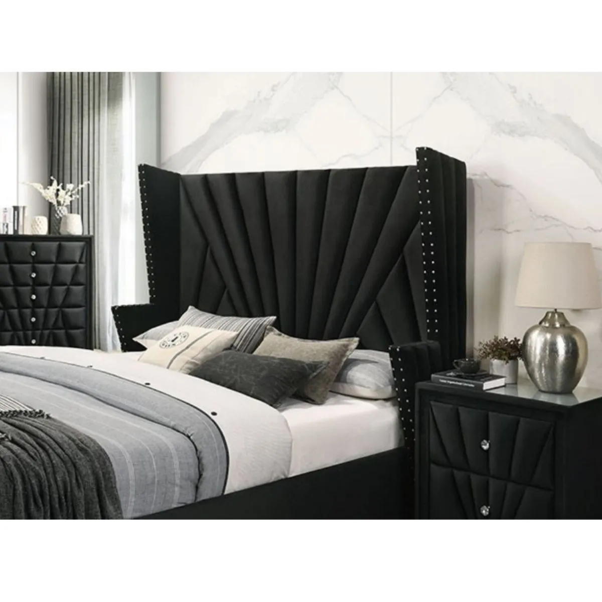 Cama negra de estilo art déco de transición con marco totalmente tapizado cabecero de ala molduras en forma de clavo y pomos acrílicos de cristal