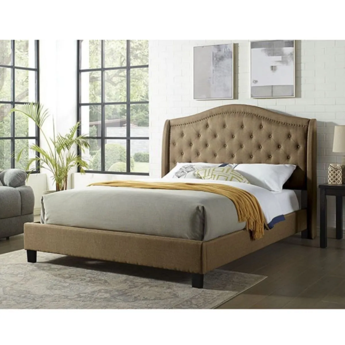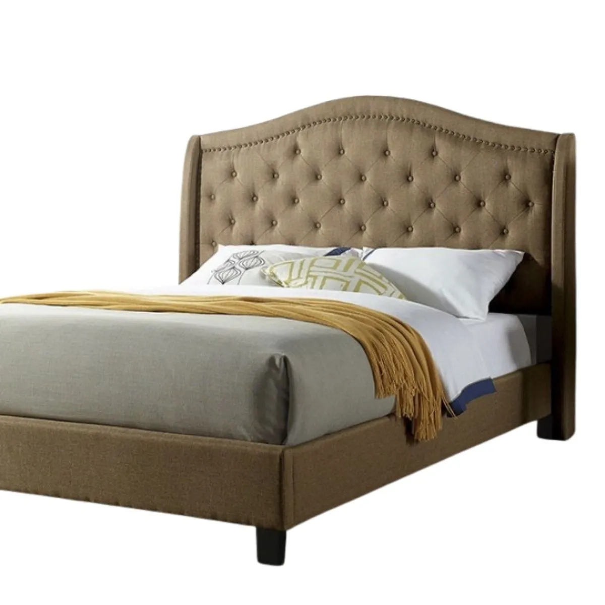 Cama de plataforma en tonos marrón oscuro con cabecero tapizado capitonado y ribete de tachuelas, diseño curvo tipo camello.