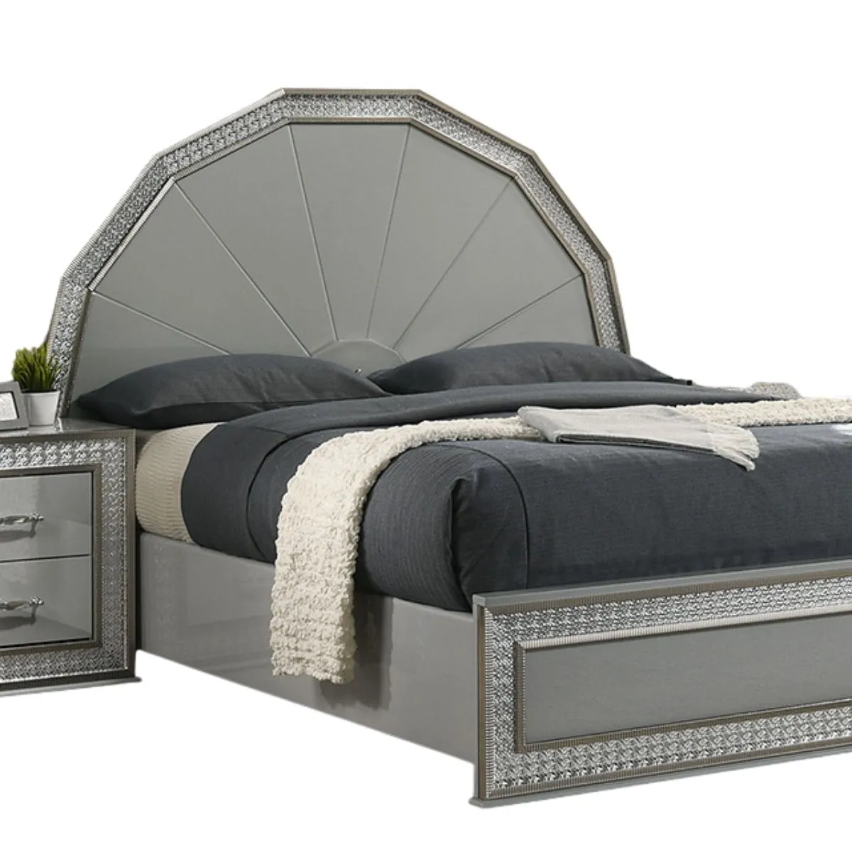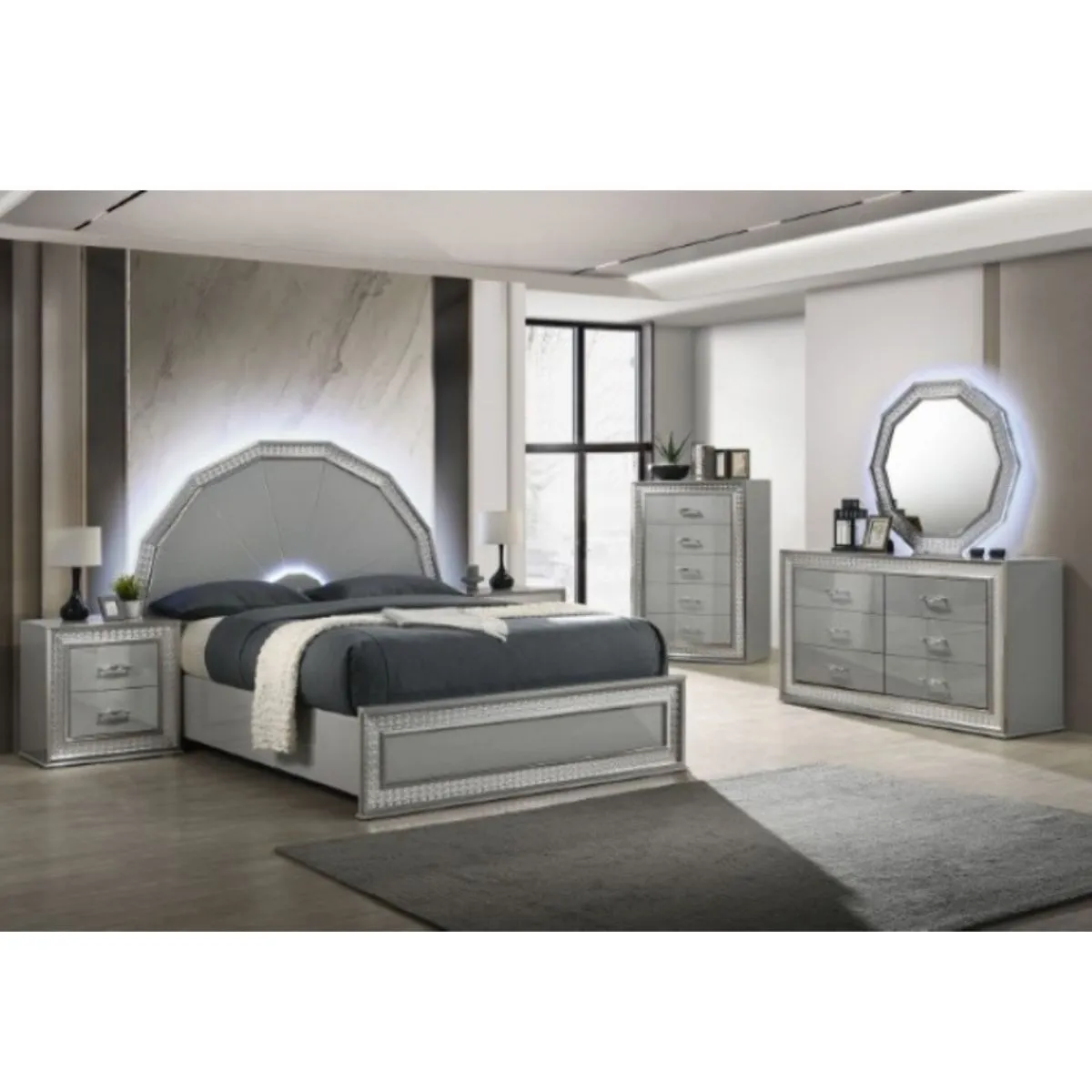 Cama gris metálico glamuroso con siete cabeceros rayados iluminación LED con paneles espejados molduras metálicas y cajones forrados de fieltro