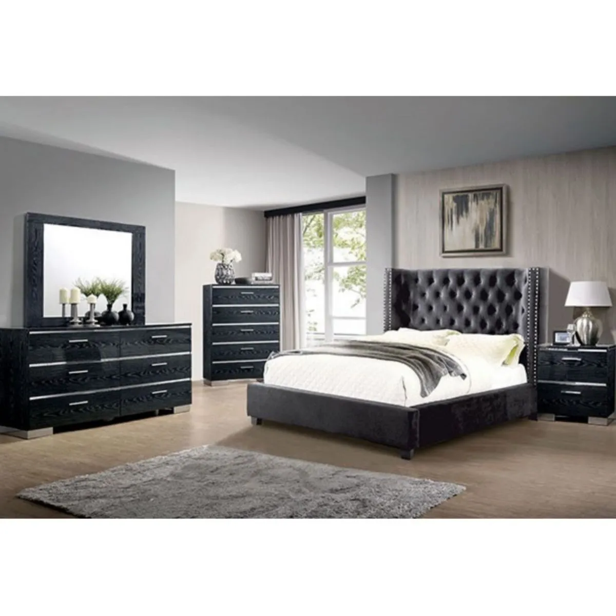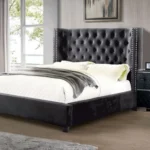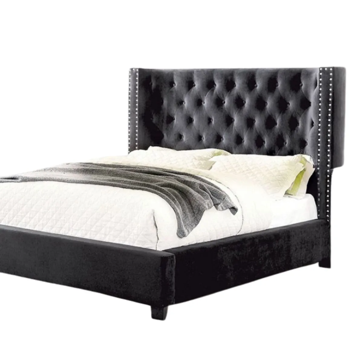 Cama de madera con paneles en V cabecero alto cargador USB y almacenamiento en cajones con herrajes de níquel