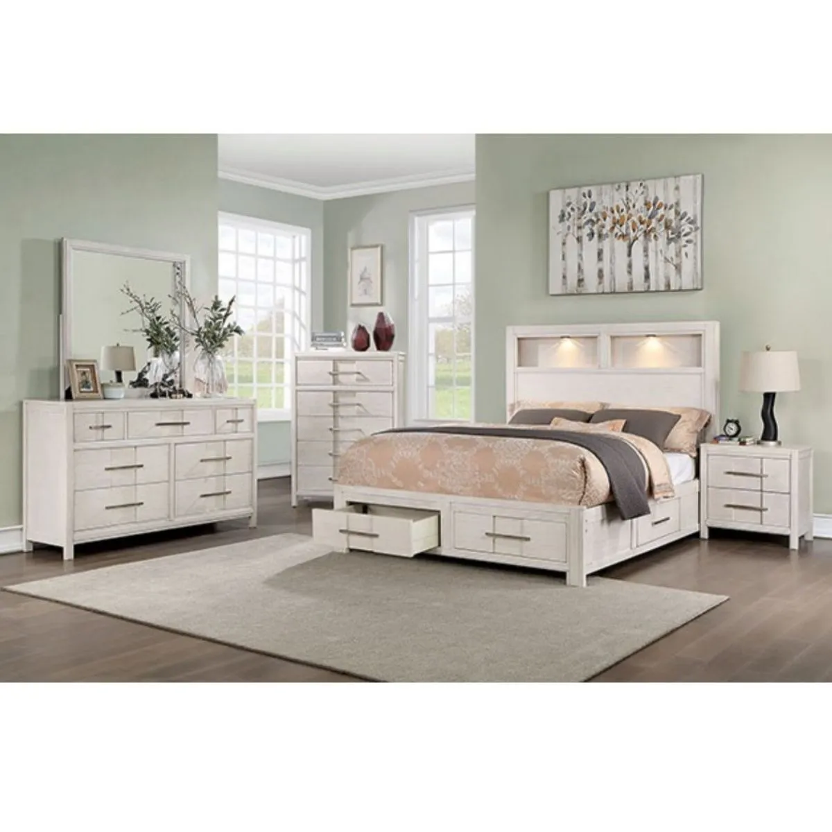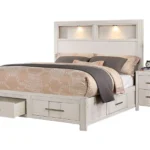 La cama plataforma blanca contemporánea con iluminación LED ambiental bajo los bordes y cabecero cromado con acabado brillante