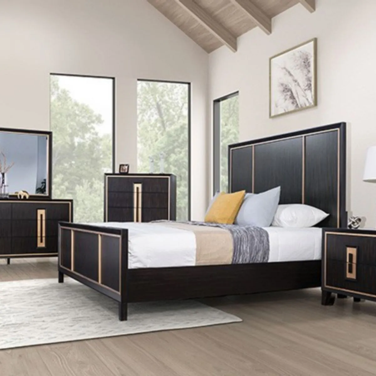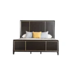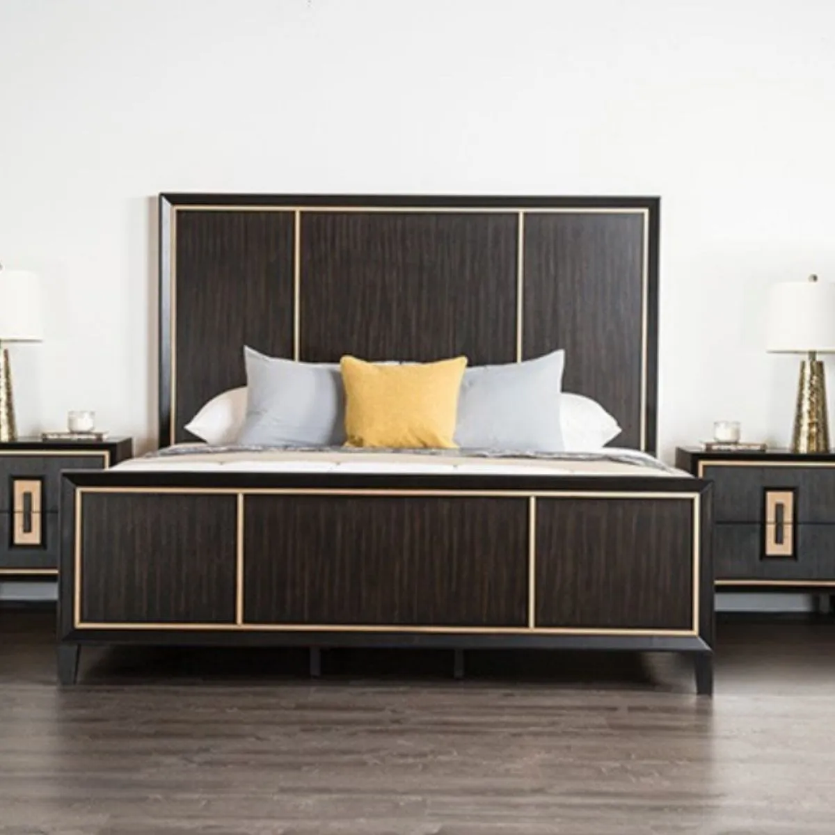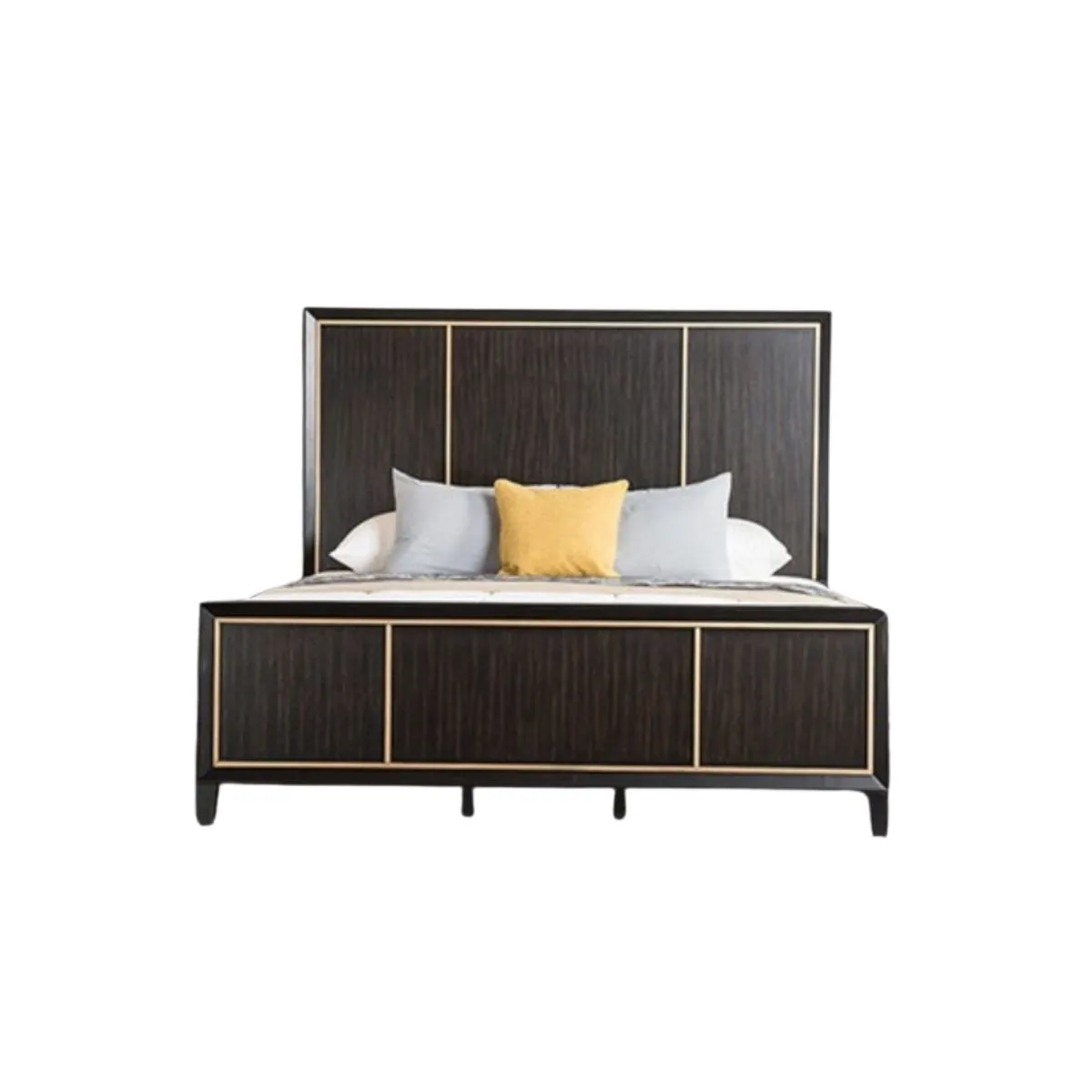 Cama espresso contemporánea con cabecero y pie de panel con detalles dorados y detalles de espejo biselado
