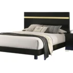 Cama contemporánea negra y dorada con estuches LED antipolvo bajo la caja bolas cojinetes patas metálicas con soportes molduras acrílicas y diseño listo para colchón