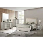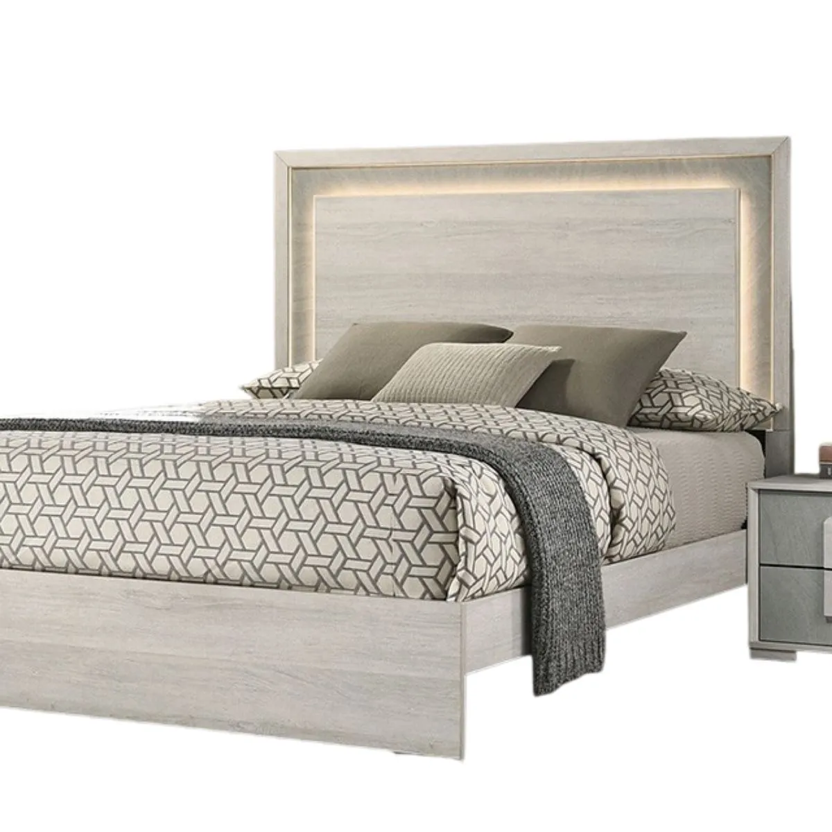 Cama contemporánea de piedra blanca gris con cabecero LED y diseño bicolor con construcción en melamina