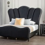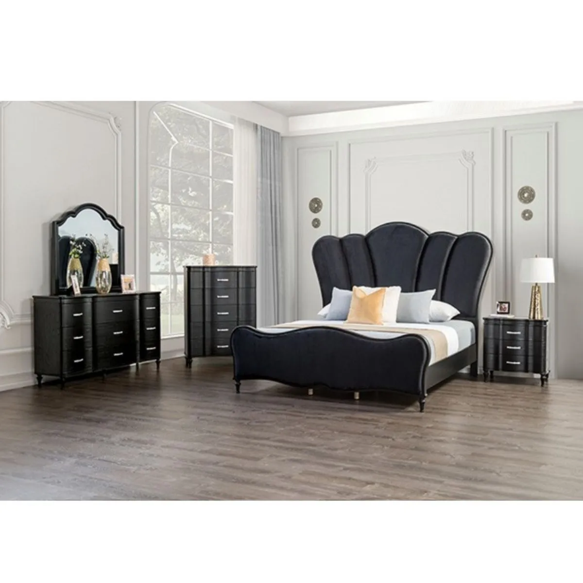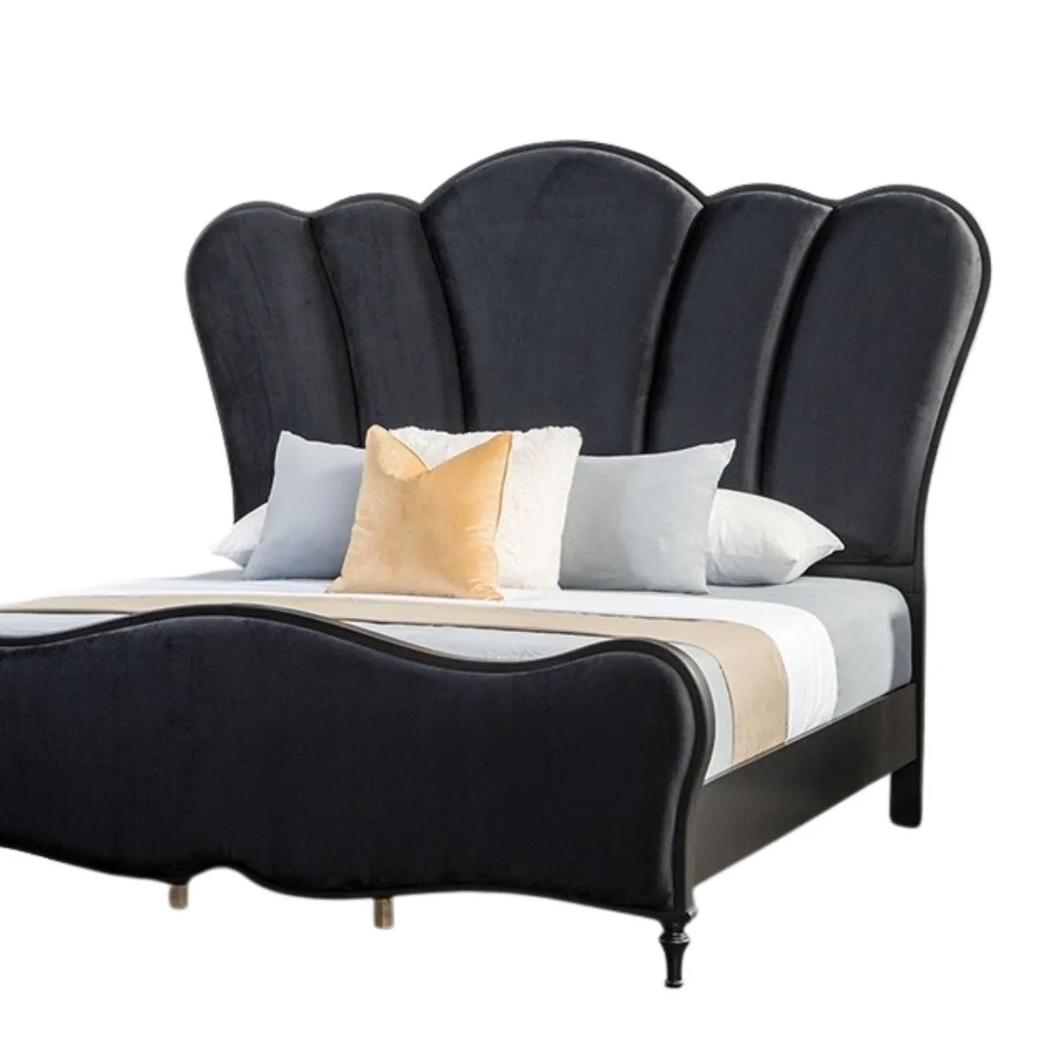 Cama negra glamurosa con cabecero acolchado y asas acrílicas de cristal con paneles frontales curvados para una estética dramática de dormitorio
