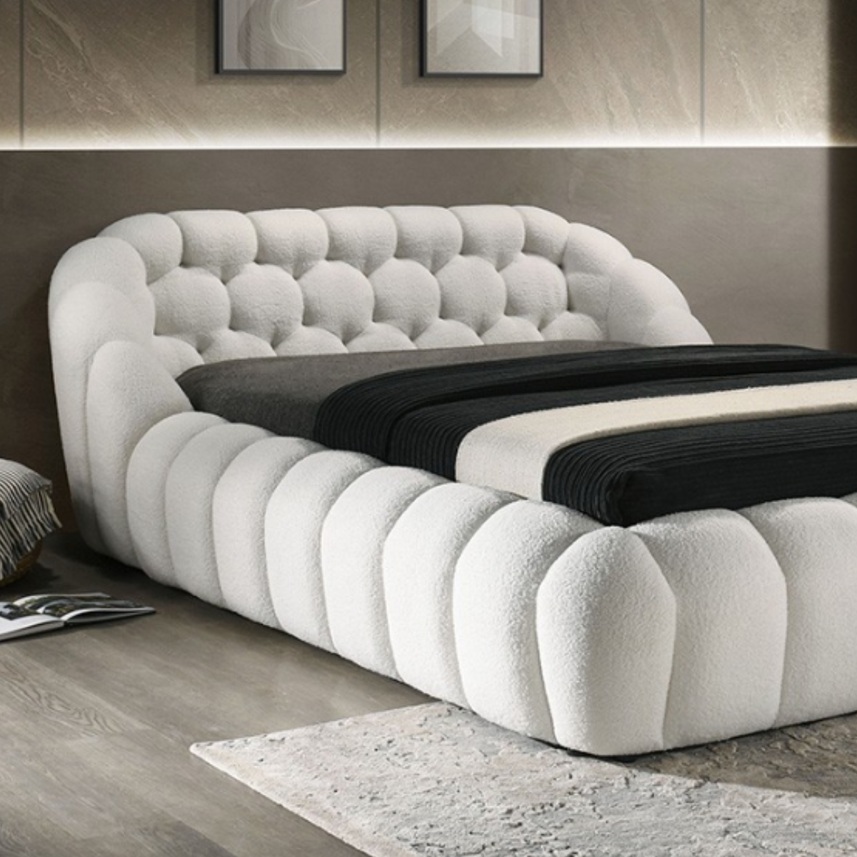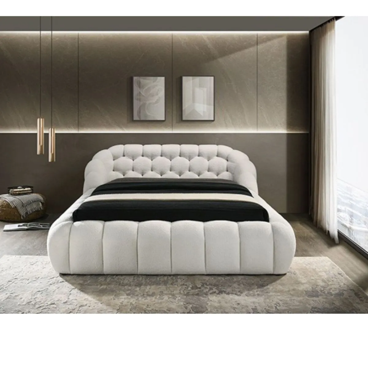 Cama blanca contemporánea tapizada en tela chenilla mullida con marco de madera maciza componentes de plástico y madera ingeniera diseño de colchón listo