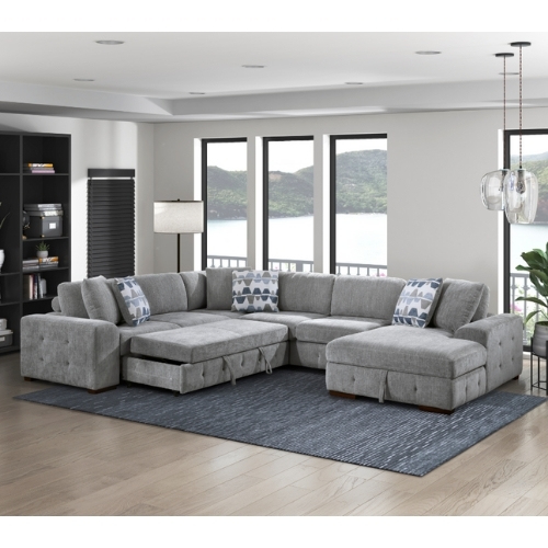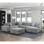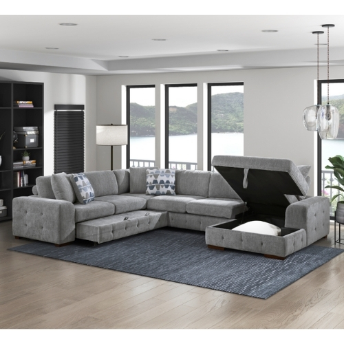 El amplio espacio para sentarse de la colección Raife crea un lugar cómodo perfecto para entretenerse o simplemente relajarse. La sección permite múltiples configuraciones con componentes individuales que constan de, una tumbona del lado izquierdo una tumbona del lado derecho una unidad de dos asientos sin brazos una unidad de esquina una biplaza del lado izquierdo y una biplaza del lado derecho cada una con una cama plegable así como un centímetro de espuma viscoelástica en los asientos y la otomana de almacenamiento. La cama plegable almacenada debajo de la unidad de dos asientos se abre para crear un amplio espacio para la extensión de las piernas completas. El asiento elevable de la tumbona se abre para revelar el almacenamiento oculto perfecto para mantas y almohadas. Para reforzar las capacidades funcionales de la colección se encuentra la otomana cuyo asiento se eleva para revelar un almacenamiento discreto. La tapicería de tela texturizada gris cubre el grupo de asientos.