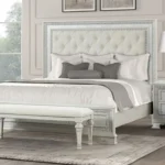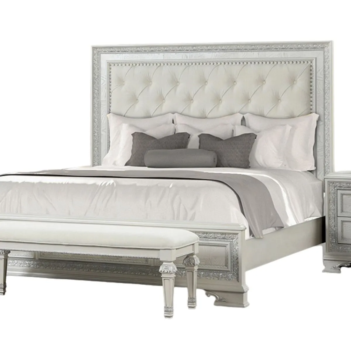Cama tradicional blanca cremosa con tapicería de botones y acentos ornamentados en plata y cajones forrados de fieltro