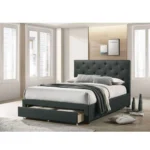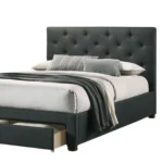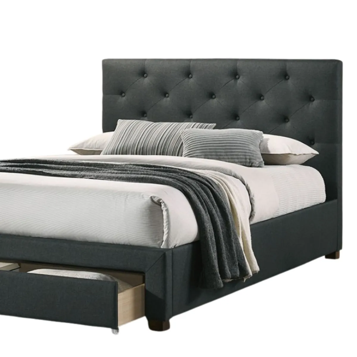 Cama tapizada gris oscuro de estilo transicional con cabecero capitonado y cajón inferior con ruedas, estructura lista para colchón.