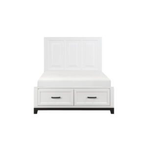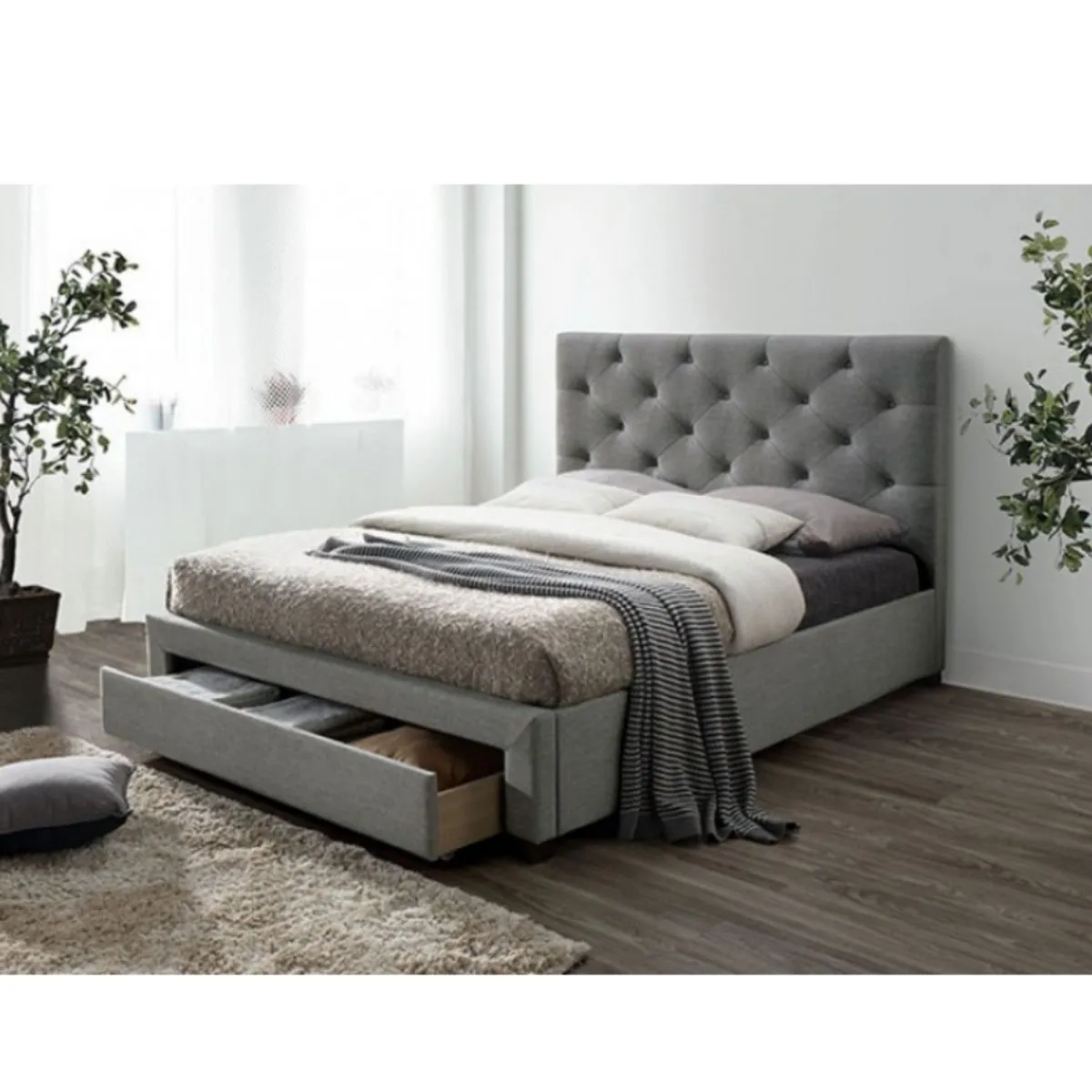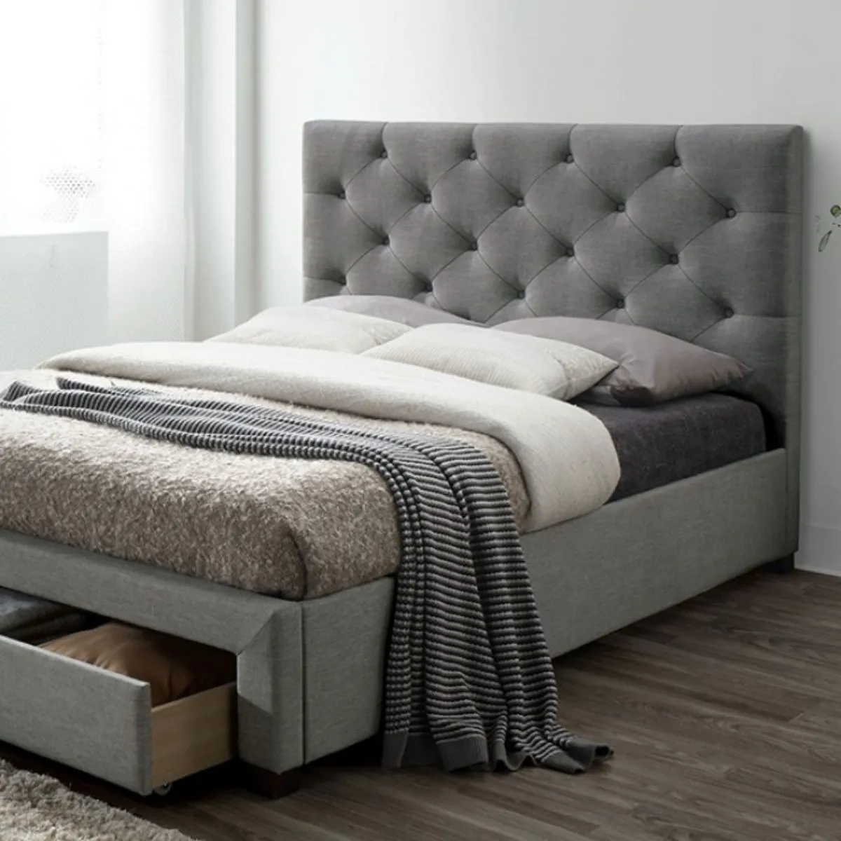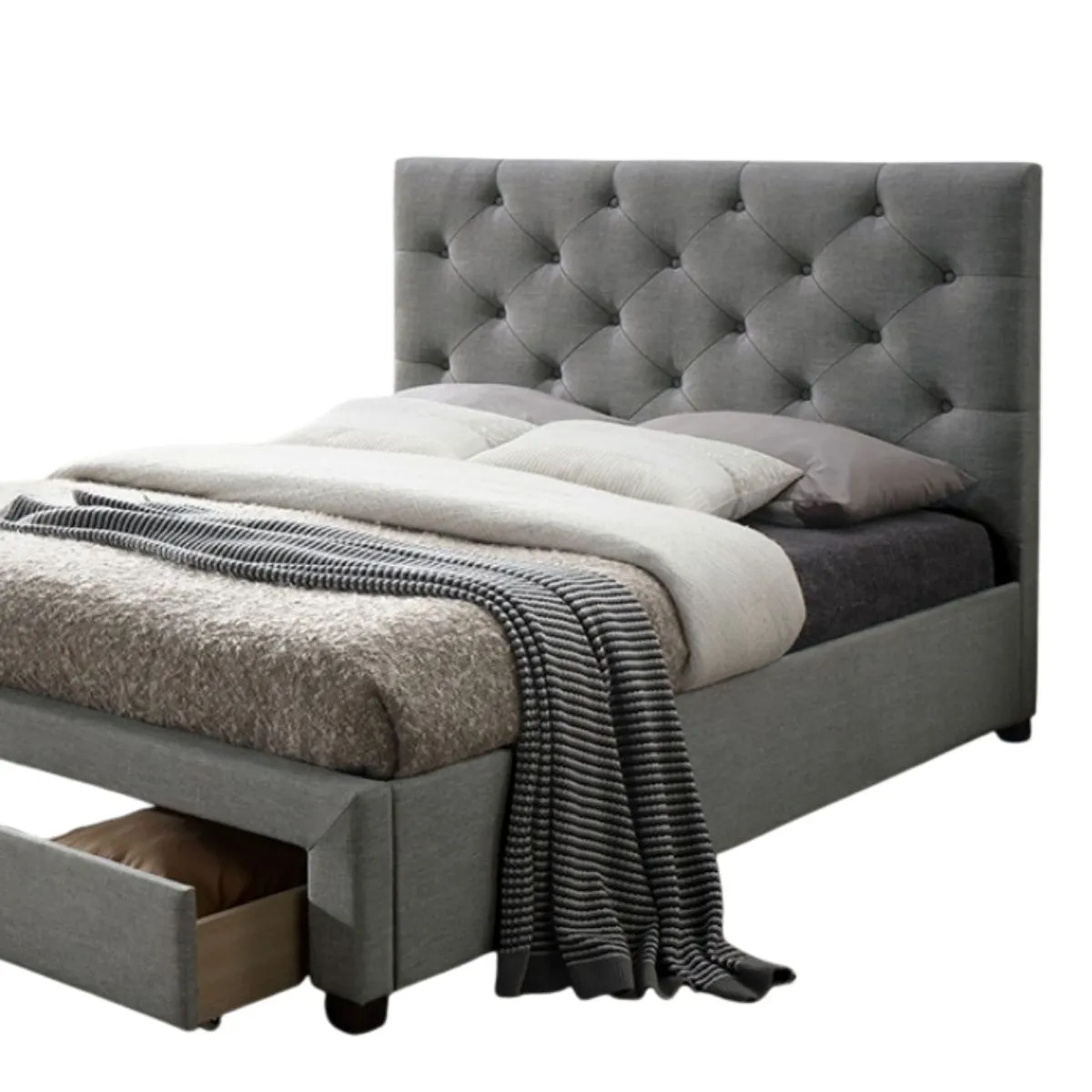 Cama tapizada gris de estilo transicional con cabecero capitonado y cajón inferior con ruedas, estructura lista para colchón.