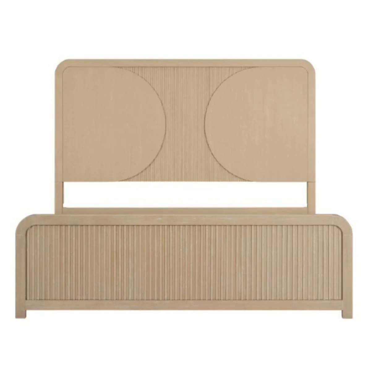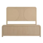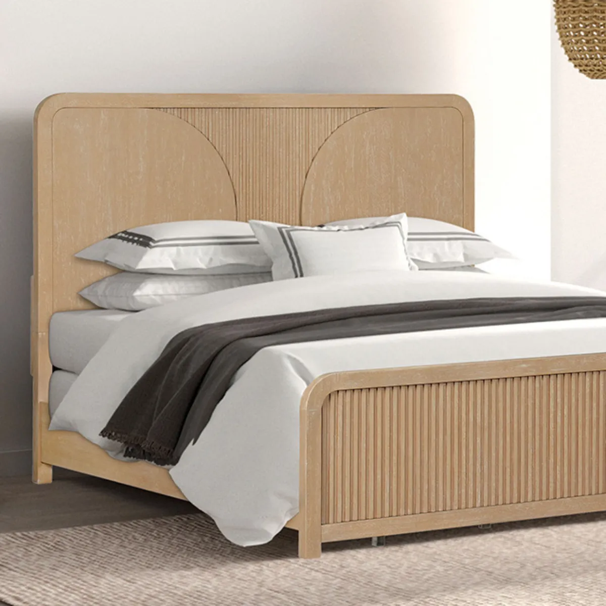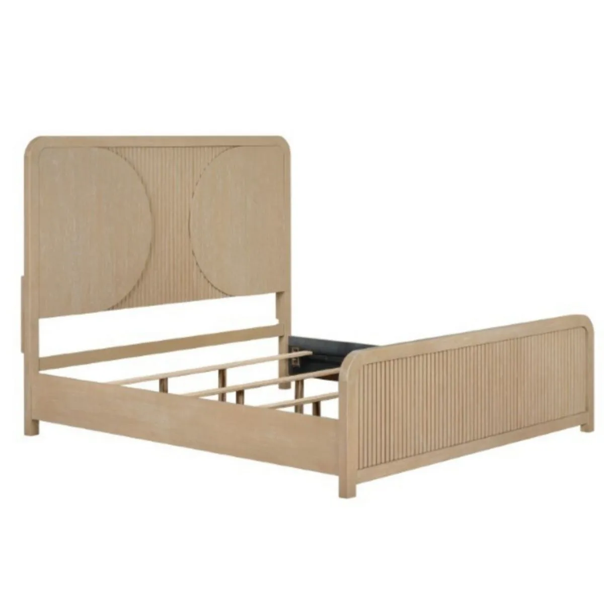 Cama natural moderna hecha de madera maciza de caucho con paneles de lengüetas redondeadas bolas de rodamientos y convenientes puertos USB en la mesilla de noche