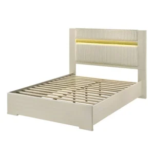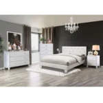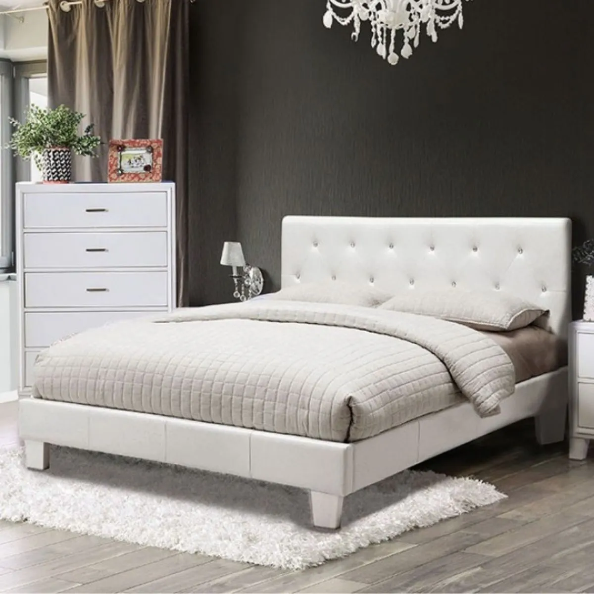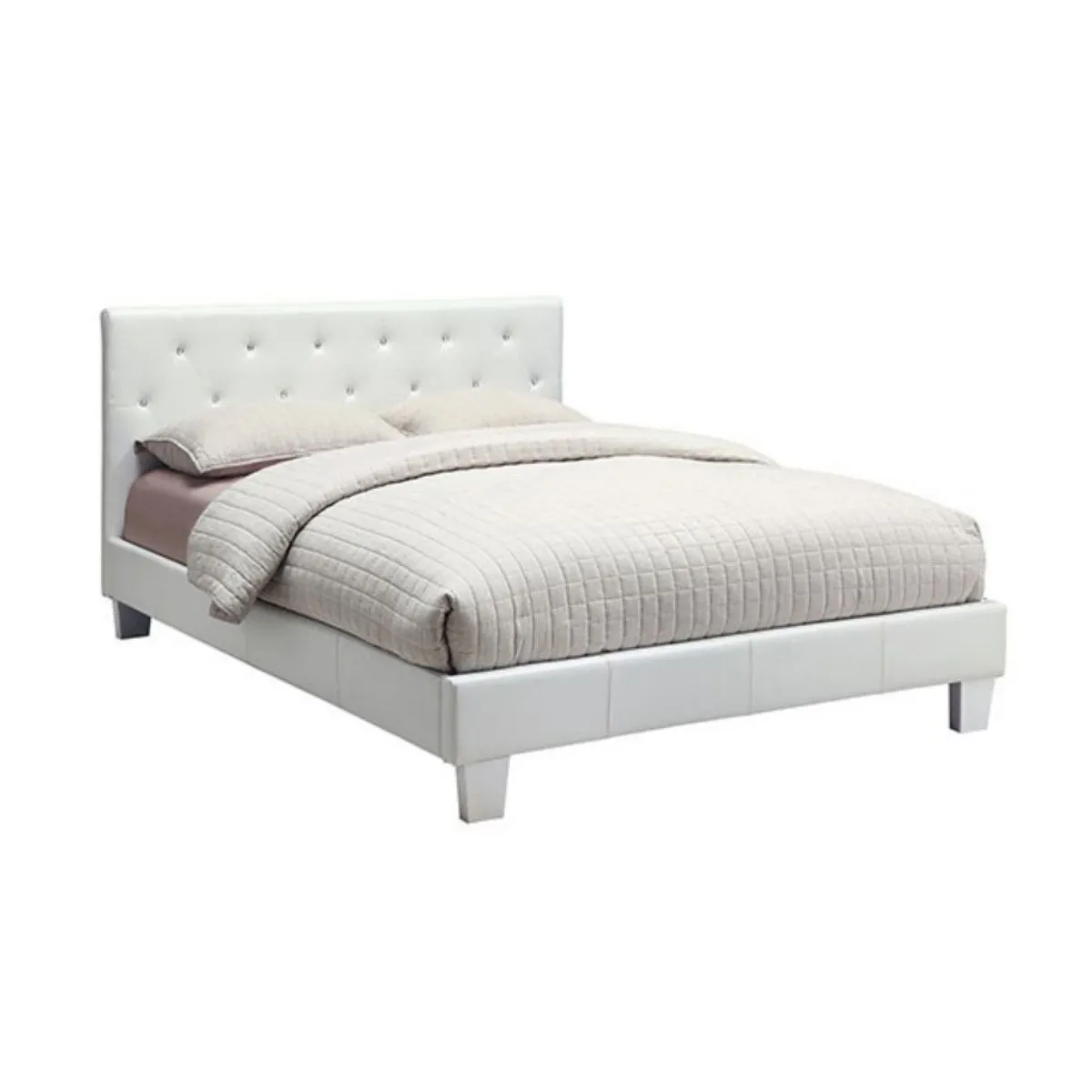 Cama tapizada blanca con cabecero capitonado adornado con botones acrílicos tipo diamante y kit de láminas incluido.